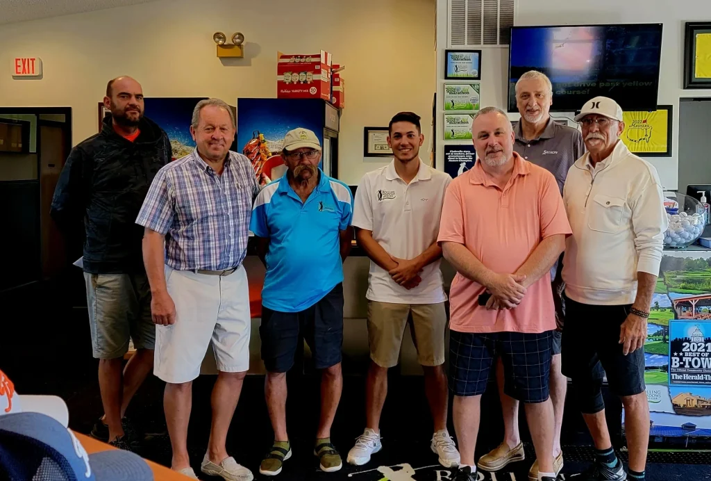 From left to right: Greg Granger (Head Groundskeeper), Charlie Hardesty (Vice President), Steve Stranger (Superintendent), Tanner Kolbe (Operations Manager), Brian Wise (Pro Shop), Del Backs (President), Jack May (Pro Shop Manager)